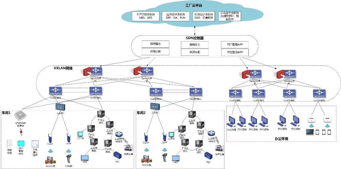 本方案旨在為制造業(yè)企業(yè)提供一套可靠的智能工廠網(wǎng)絡(luò)建設(shè)方案。方案利用工業(yè)物聯(lián)網(wǎng)、SDN、IPv6等新興技術(shù),實(shí)現(xiàn)工業(yè)場(chǎng)景下人員、設(shè)備、物料、產(chǎn)品的海量互聯(lián),為工廠實(shí)現(xiàn)智能生產(chǎn)、協(xié)同制造和柔性制造提供網(wǎng)絡(luò)支撐。