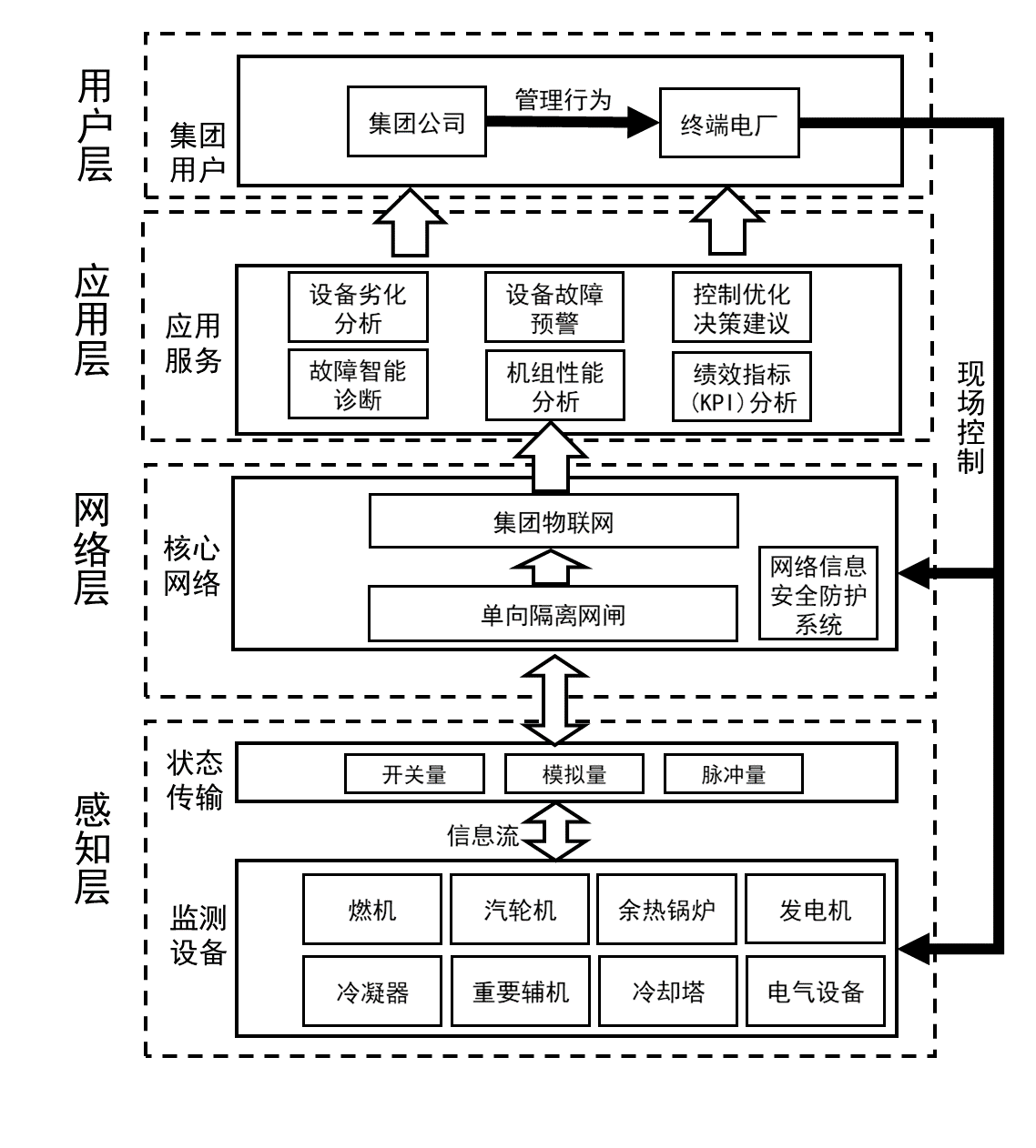 應用層是物聯網和用戶層的結構,它與電力數據監測診斷的需求結合,可實現物聯網智能應用。主要功能是:1.數據采集與集成;2.設備性能劣化和故障預測預警;3.設備熱效率分析;4.電廠關鍵績效指標(KPI)分析。5.機組控制優化決策建議。6.設備狀態檢修排序。
